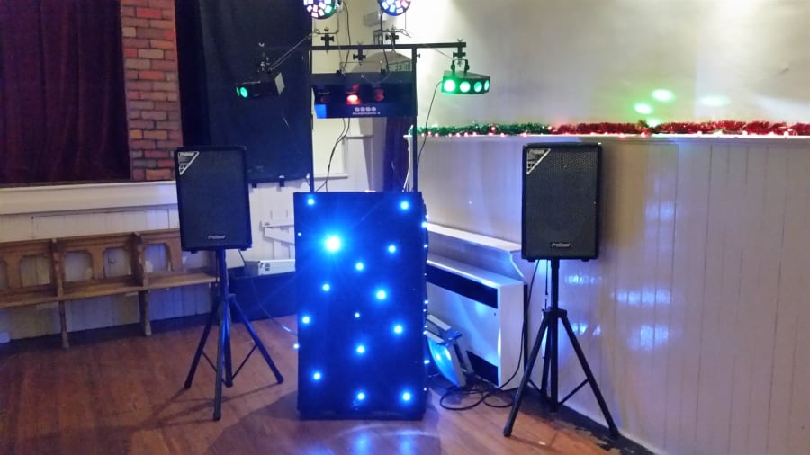 You get a full mobile disco set up including the DJ booth, Speakers, Amplifier and a full mobile light show with lasers, strobes and lights.